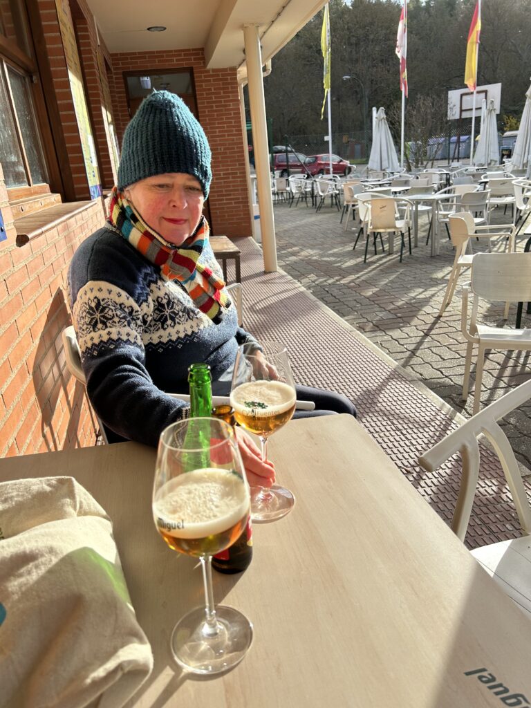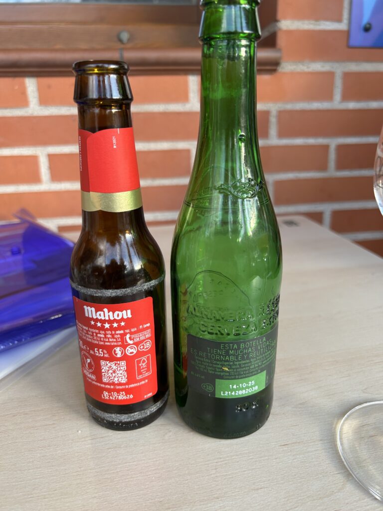 Nette camping, horeca open. Op terras aangenaam zacht Spaans bier gedronken in groene fles en kennis gemaakt met echtpaar Tim & Lynda Gornall uit Groot-Brittannië.