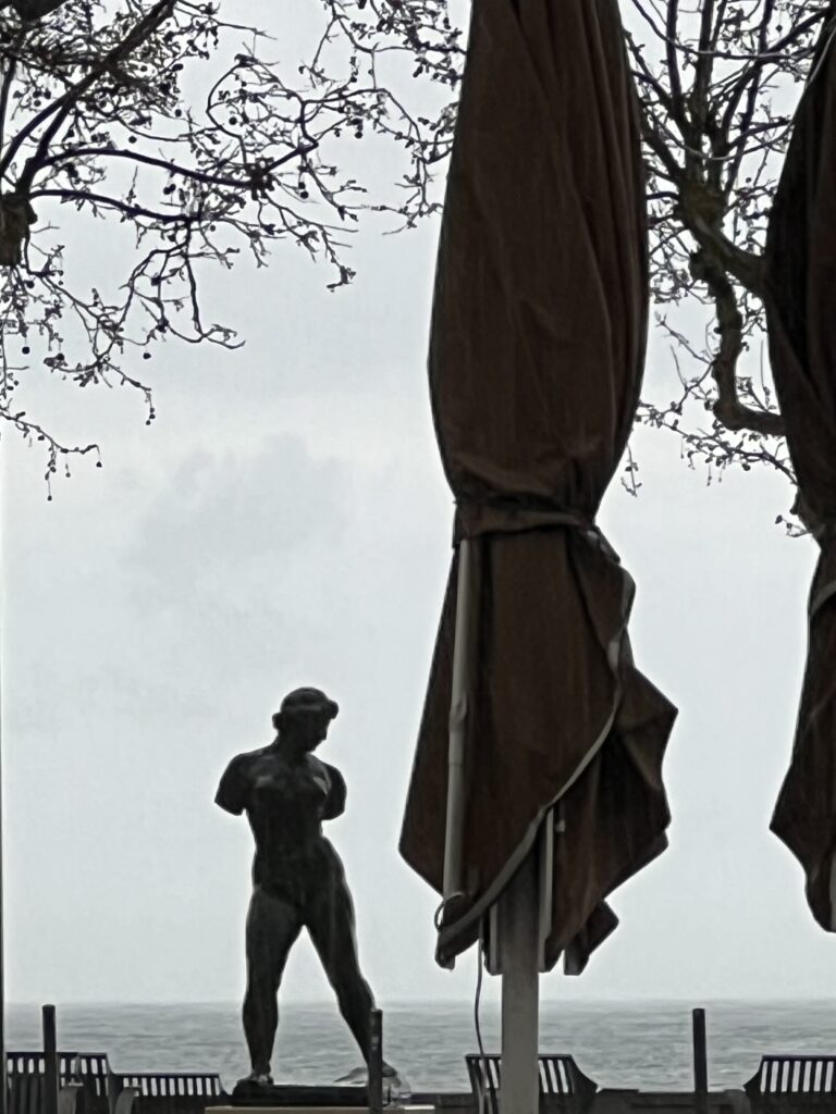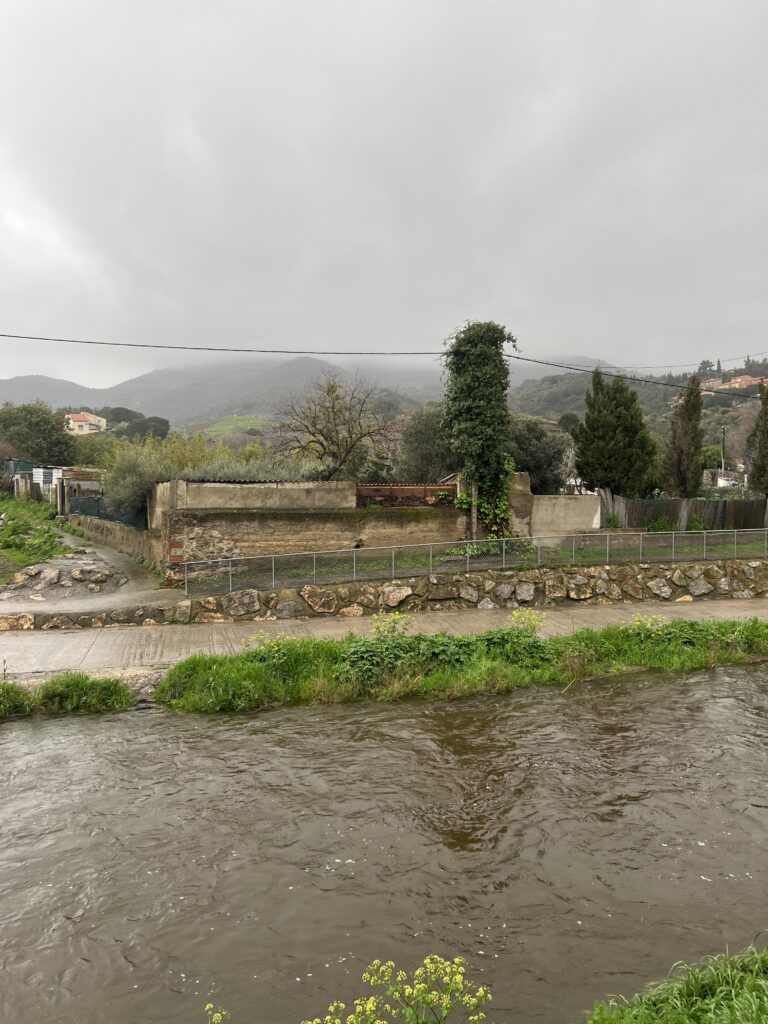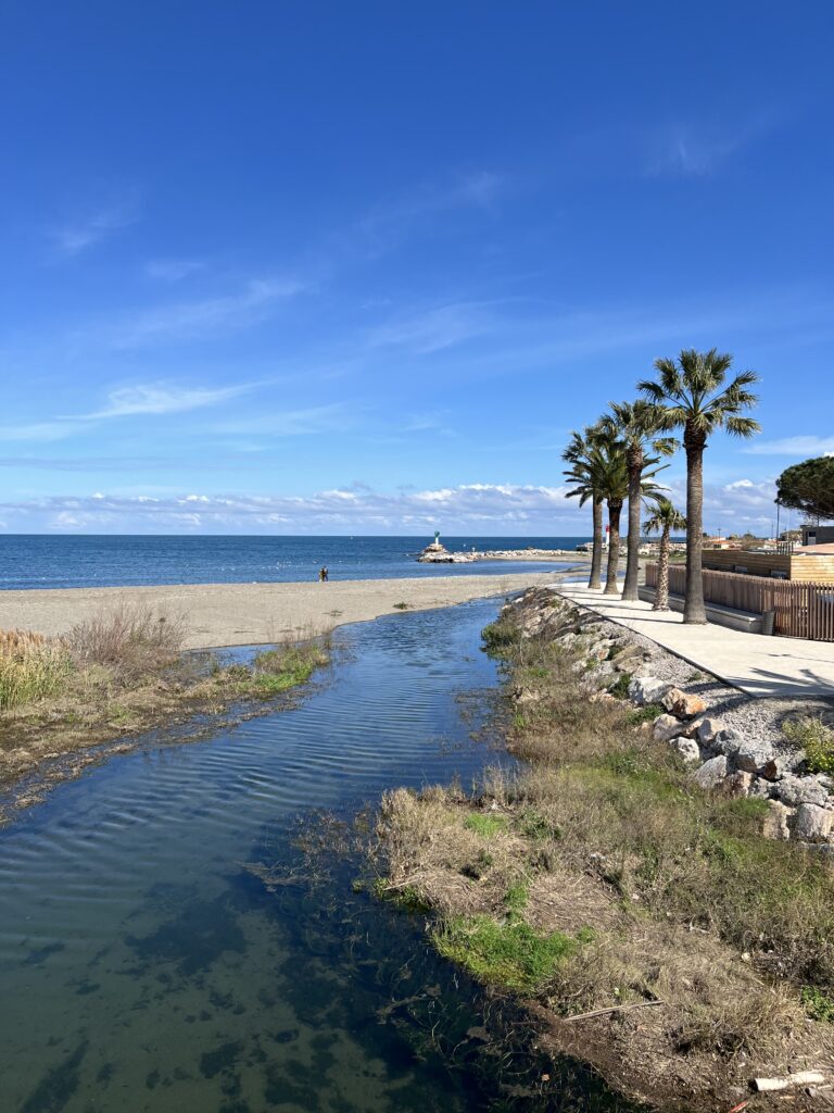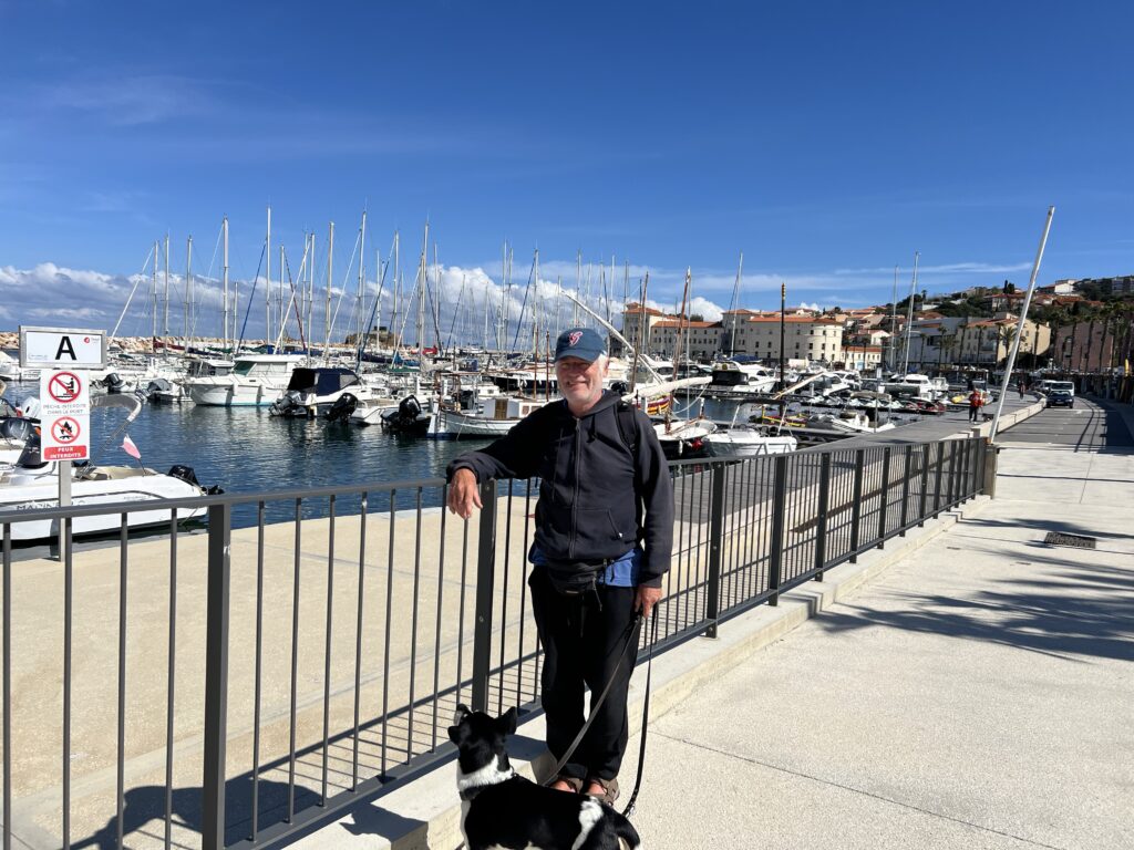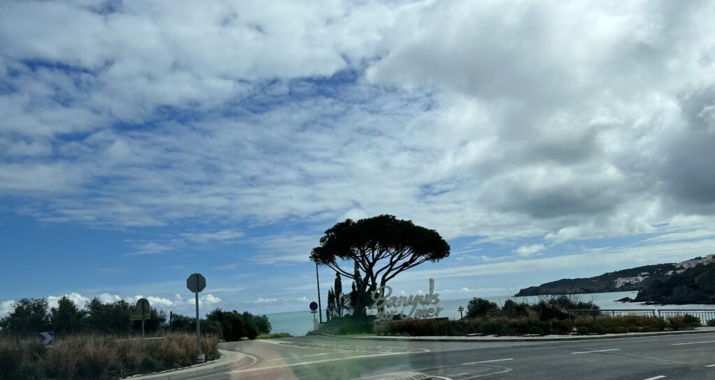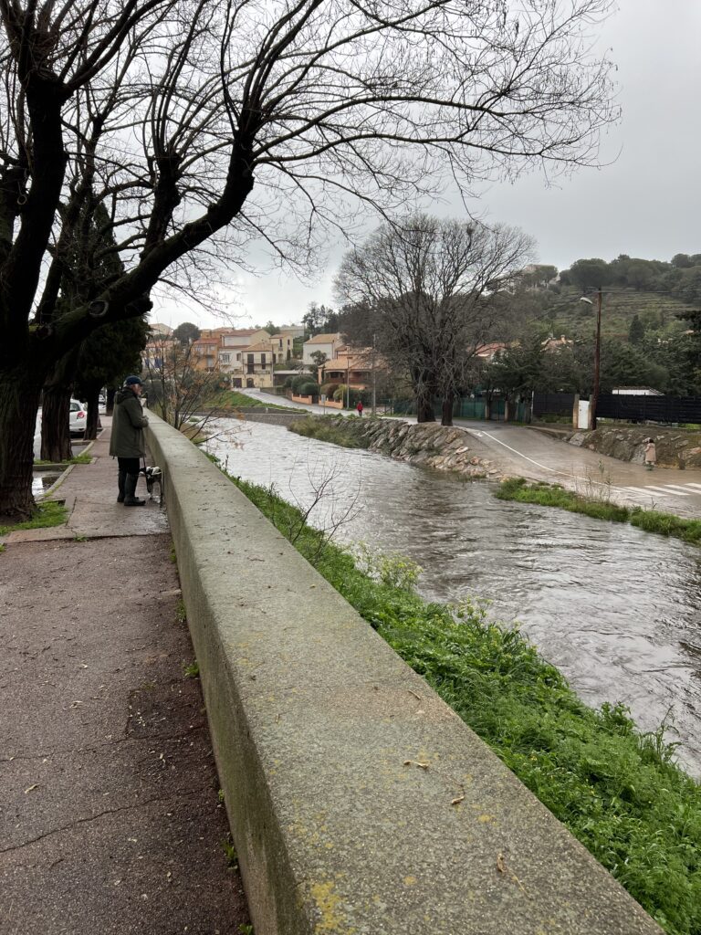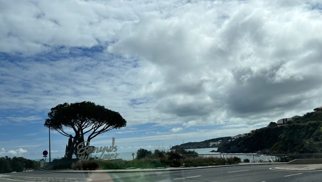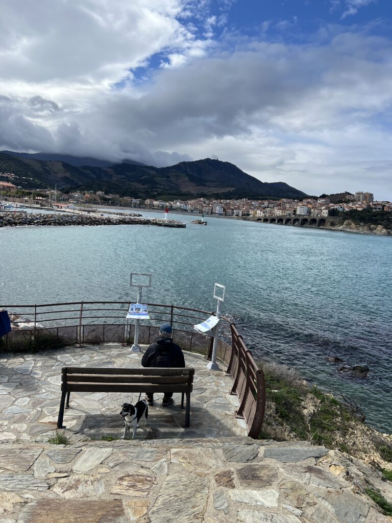 Het strand van Banyuls-sur-Mer ligt in een inham van de Middellandse zee en de periode dat wij er waren hebben we woeste zee en kalme zee ervaren. Zomers is het druk op het kiezelstrand en in het voorjaar zie je af en toe mensen die wat oprapen. Er komt een riviertje aan de Zuidkant van de baai in zee. normaal een klein stroompje en na flink wat regen een serieuze stroom. Op de boulevard is het netjes en zie je geen zwerfvuil in tegenstelling tot de meeste Spaanse standen die wij gezien hebben. Kennelijk is er genoeg budget voor kunst en cultuur want je ziet overal sculpturen van kunstenaars en kunstenmakers.