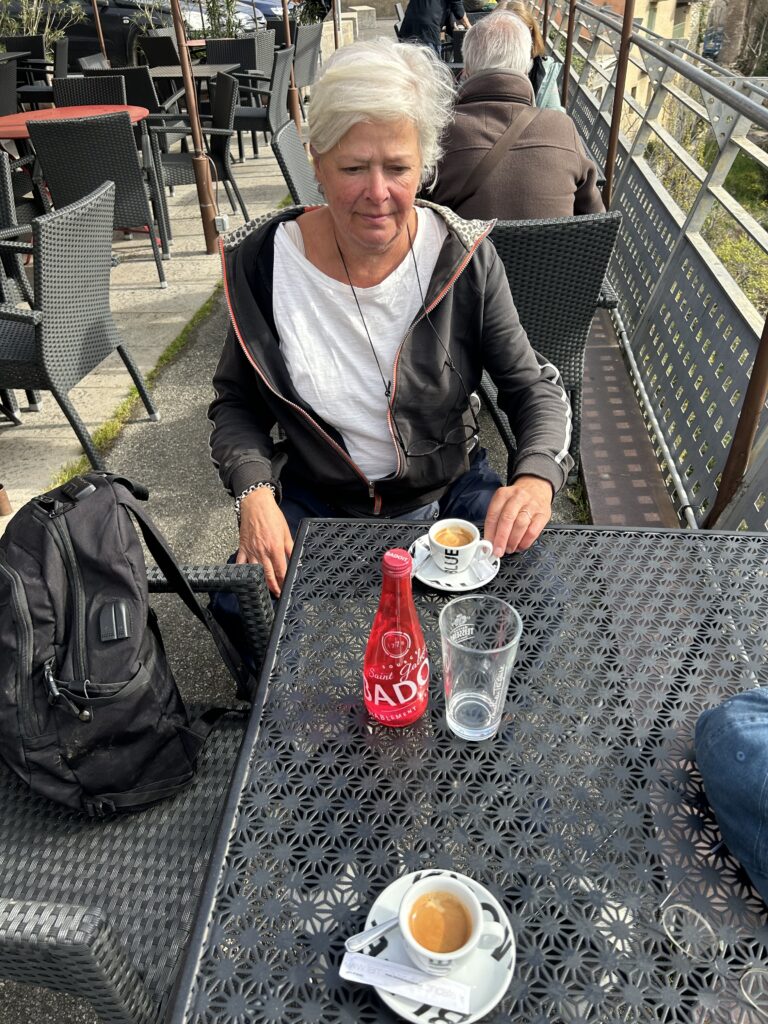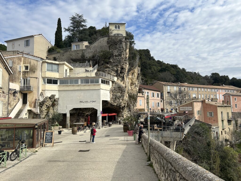 Koffie gedronken op leuk terras aan de rand van de rivier de Aiges [Eygues]. De rivier stroomt meters lager en op de hoek van het horecabedrijf is sinds honderden jaren een prachtige stenen brug te vinden.