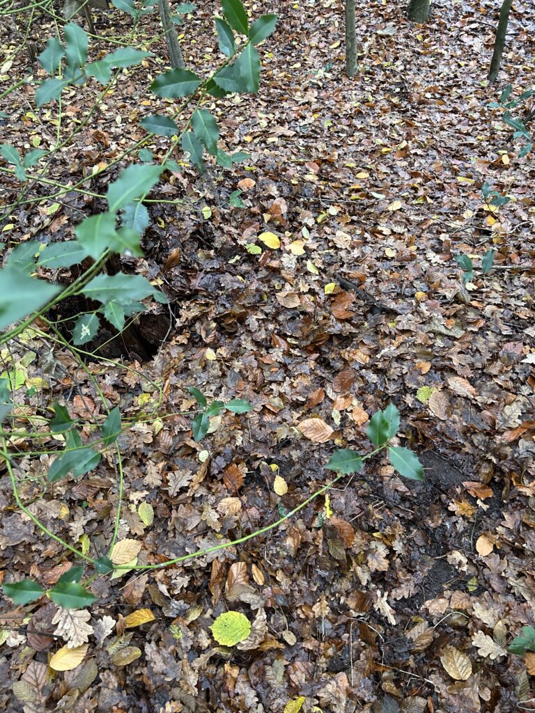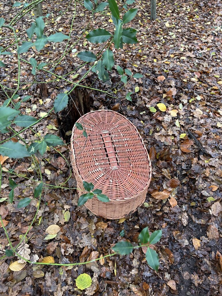 Het derde egelhuis is gemaakt door oude rieten mand van Hennie ondersteboven in het bos te plaatsen. Ook hierin is een opening gemaakt zodat de egels in en uit kunnen lopen.