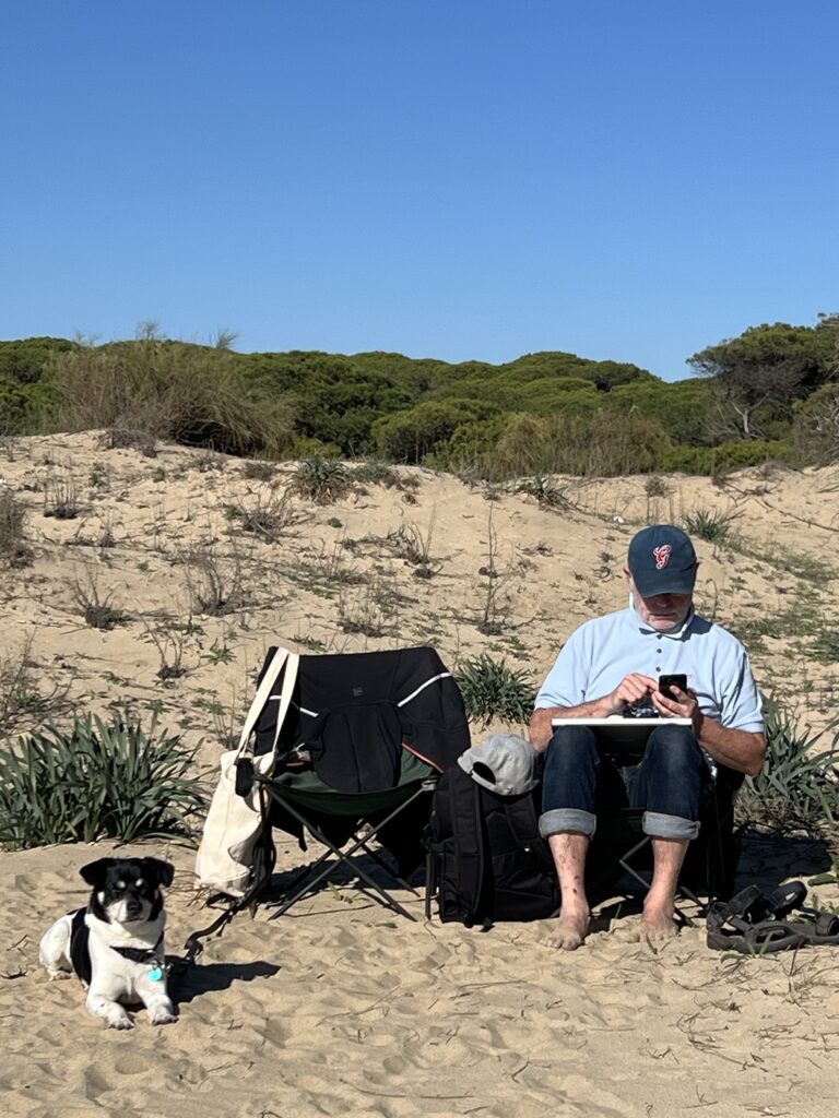 Op de camping valt het ons op dat enkel Engelstalige gasten [UK, Ierland, Scandinavië] beleefd goedendag zeggen. Duitse mannen stereotiep met veel te dikke buiken en pikken terrein in van buren. In ons geval staat op Parcela 12, direct naast ons Manzana 10, Parcela 11 een Duits echtpaar met grote ‘Sudwind‘ caravan en twee fietsen. Aan de overzijde van het zandpad precies tegenover onze plek staat een Opel Vivaro bestelauto geparkeerd. En dan zitten zij ook nog pontificaal tegenover hun plek in stoelen in de zon. Blijkt dat zij een grote kat of kater hebben die los onder hun caravan ligt en af en toe eronder uitkomt en niet bang van Hennie.